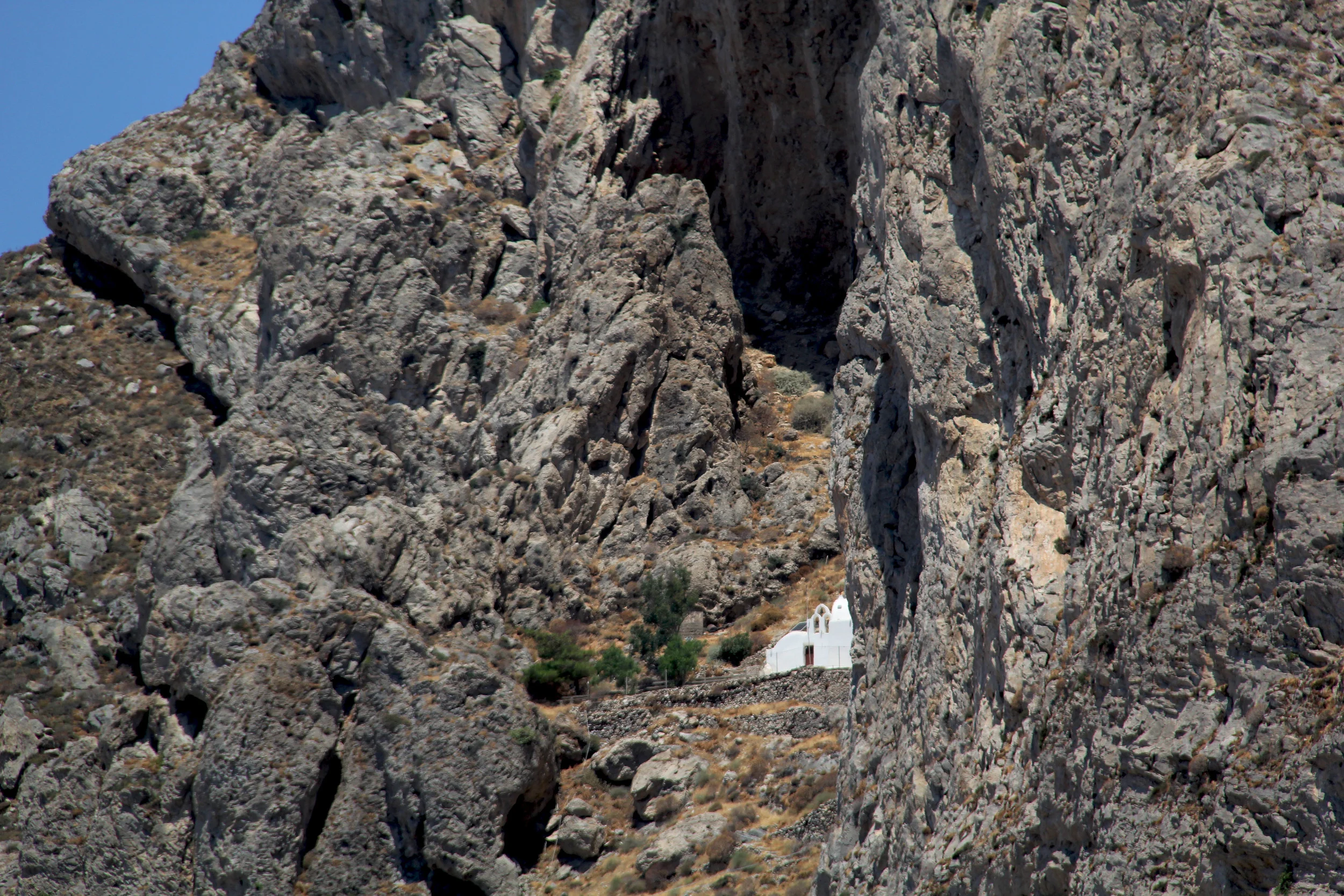 Day two was spent at the beach again. We headed to the southwestern part of the island seeking out the “Red Beach” also known as Akrotiri Beach. It was absolutely beautiful. We had to do a small hike down to the actual beach, which was at the bottom of a cliff of red rock. This beach was largely small rock, with just a bit of sand making enjoyment of the water hard, but the being surrounded by the red rock outweighed the sand. After a few hours we departed, continuing west to Messa Pigadi Beach where we grabbed (a crappy) lunch, and eventually the water taxi to the illusive “White Beach.” We had tried in vain to drive to it earlier, following our handy dandy map, but couldn’t find it. We asked our waiter, who shared that we would need to take the water taxi. So we did. What he didn’t share was that there was no dock at the “White Beach,” also known as Aspri Beach, and that you had to wade your way to shore. Stop now and picture Jared and I with all of our stuff perched on our heads (including our phones, books, wallets, and brand new fancy camera) jumping from a boat into cold water with a rocky ground underfoot. I’m sure it was quite a site. We enjoyed Aspri Beach, despite the fact that it was ALL rock, no sand at all, and pretty bare bones. The only thing it had to offer beyond the standard beach chairs and umbrellas was an older gentleman peddling fresh fruit, mostly melons, that he sliced with an old school pocket knife, right in front of you for a few Euros. We didn’t partake, but it was fun to watch. The sun was super strong too, making our periodic dips in the water refreshing. We departed later in the afternoon (making it back to the water taxi in one piece.) During our drive back to Imerovigli we stopped at a small farm stand shop, The Good Heart, for some Greek goodies, and small world that it is, the woman who owned the shop shared that she and her little stand would be on Giada De Laurentiis Food Network show this September, that the crew had been there filming that morning (which we saw when we had driven past in initially). I shared that we were big Food Network fans and would tune in. From there we drove back to our hotel, stopping for some scenic views and pictures along the way. We spent a few hours near the pool (continuing to relish our view of the caldera). Later in the evening we went into Fira, the capital of Santorini, and had dinner at Koukumavlos Restaurant (it was excellent) which had a beautiful outdoor terrace. Similar to our evening in Ia, we strolled through town after dinner, before heading back to our hotel. The next morning we packed our bags, returned our quad, and walked the 25-minute walk back to Fira, all along the caldera. While there, we walked through their Catholic church, the beautiful St. John The Baptist, and the Santozeuum, a gallery where we viewed wall paintings from the ancient village of Akrotiri. We had lunch at Vanilia Restaurant and Bar (a Fodor’s suggestion that was ON THE MARK) before heading back to our hotel. We spent some time by the pool again, and headed to the port around 4:30 for our ferry (which was late, surprise surprise) to Crete.